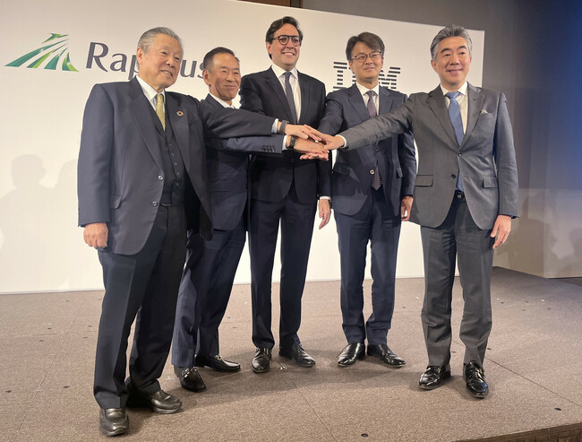 いまラピダスには東会長と小池社長の仲間10人ほどが入社の準備中だという[米IBMとの提携を発表した(左から)東哲郎会長、小池淳義社長、IBMのダリオ・ギル上級副社長ら=12月13日](C)時事
