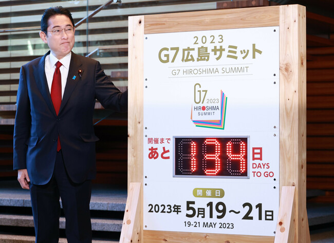 G7広島サミットカウントダウンボードの点灯式に臨む岸田文雄首相=5日午前、首相官邸(C)時事