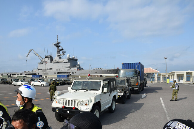 自衛隊が戦闘に注力する状況下では、石垣島民(約5万人)の避難に使う船舶や航空機は不足する可能性が高い[海自輸送艦から降りて石垣駐屯地に向かう陸自車両=2023年3月18日](C)時事