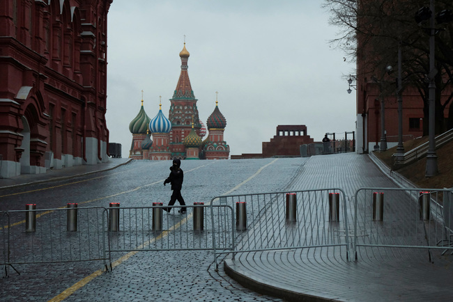 コンサート会場「クロッカス・シティ・ホール」での銃撃事件後、警備強化のため閉鎖された赤の広場を歩く警察官=2024年3月23日、ロシア・モスクワ (C)REUTERS/Shamil Zhumato