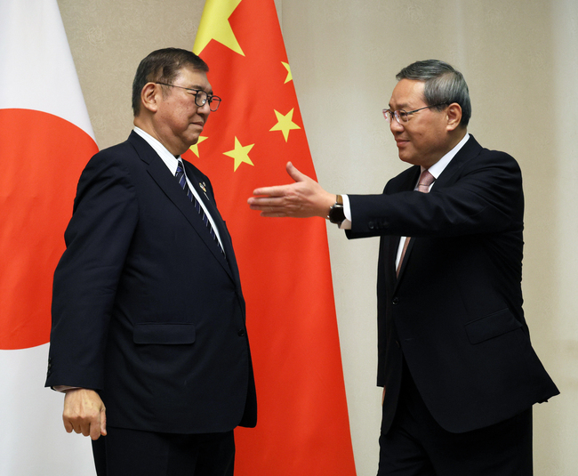 新政権に対する中国の期待はかなり高い[東アジアサミット(EAS)が開催されたラオスで中国の李強首相と会談した石破首相=2024年10月10日、ラオス・ビエンチャン](C)時事