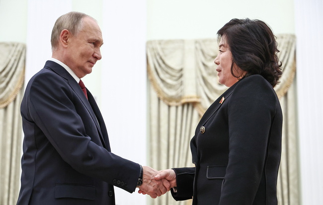 蜜月を演出するロシアと北朝鮮の間には、微妙な温度差も感じられる[モスクワを訪問しプーチン大統領(左)と面会した北朝鮮の崔善姫外相](C)EPA=時事
