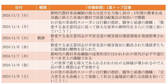 翌6日付の第1面も洪水被害復旧関連の記事であった。金正恩自身は姿を現さなかったものの、4日と5日の両日に平安北道の復旧作業に動員された建設者たちに贈物を伝達する集会が開かれたとの内容であった。平安北道の道都である新義州(シニジュ)市において11月の平均最低気温は氷点下になる。そのような中で「季節に応じた必需品」が「慈悲深い親(注:金正恩)の体臭が熱く宿っている贈物」として送られたのである。「最高司令官同志の息吹と体臭」(8月27日付)といった表現で、金正恩の「体臭」はたびたび散見される。