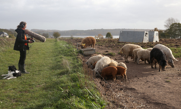 コペンハーゲン大学の行動生物学者Elodie Mandel-Briefer氏がブタの鳴き声を録音する様子を再現[2024年10月21日、ヴィッペロードの農場にて](C) REUTERS/Tom Little