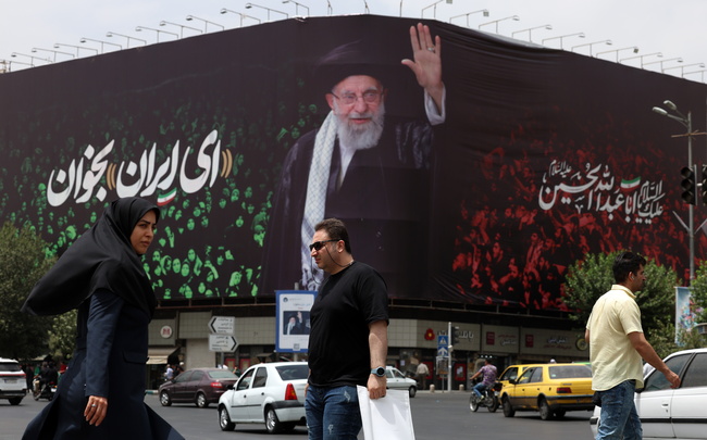 統治の安定性という観点では、イランと戦前のアフガニスタン、イラクの状況には大きな隔たりがある[愛国歌「ああ、イラン(Ey Iran)」を歌えと呼びかけるハーメネイー最高指導者の写真の前を歩く人々=2025年7月9日、イラン・テヘラン](C)EPA=時事