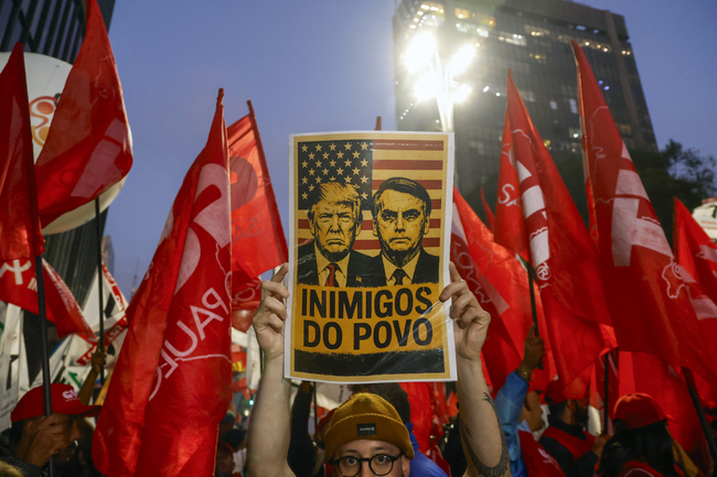 トランプ政権との関税をめぐる軋轢はブラジル国内の分断をさらに深刻化させかねない[トランプ米大統領とボルソナーロ前大統領を「人民の敵」と糾弾するプラカードを掲げた男性=2025年7月10日、ブラジル・サンパウロ](C)AFP=時事