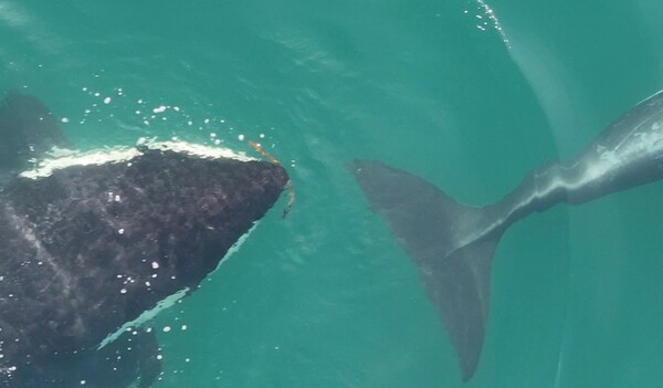 シャチが使っていたのは、ブルケルプと呼ばれる昆布の大きな茎だ。根を張っているものや、海面に浮いているものを見つけては、茎の端を噛みちぎり、別のシャチとの間に挟んで茎をこすり合っていた。