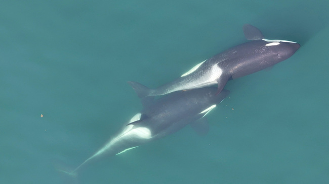 ペアになって泳ぐシャチの一頭が昆布をくわえている[2024年4月10日、アメリカ・ワシントン州アドミラルティー湾付近](C)Center for Whale Research, NMFS NOAA Permit 27038/Handout via REUTERS 拡大画像表示