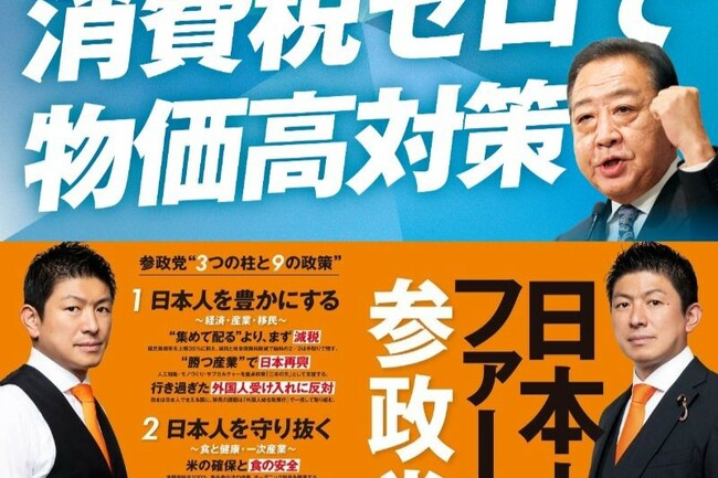 「食料品の消費税ゼロ」と「日本人ファースト」を掲げて選挙を戦う立憲民主党と参政党だが、それぞれの選挙後の戦略とは?[立憲民主党HP(上)と参政党HP(下)より]