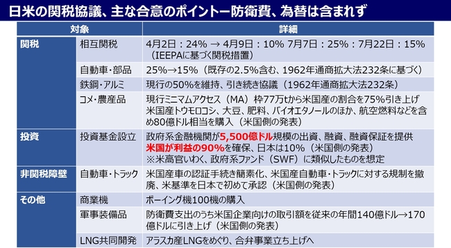 ドナルド・トランプ大統領は7月22日(米国東部時間)、トゥルース・ソーシャルで日米が関税協議で合意に至ったと発表した。トランプ氏が「史上最大のディール」と呼んだ主な合意内容は、前述した関税率を始め、【チャート1】の通りである。鉄鋼・アルミの関税引き下げのほか為替、防衛費引き上げなどは、合意に含まれなかった。なお、米国と日本の発表内容には適用日を始め、食い違いが存在すると日経新聞は指摘している。