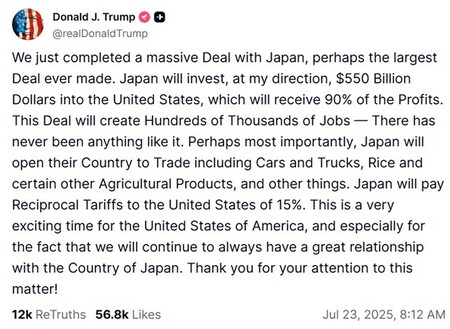 ビートルズは「金で愛は買えない」と歌ったが、関税は金で買えるらしい。少なくとも、ハワード・ラトニック商務長官によれば、そうなる。ラトニック氏は7月23日、ブルームバーグ・テレビに出演し、日本が相互関税につき4月2日時点の24%、7月7日時点の25%から15%へ引き下げられたのは、対米投資資金を5500億ドルとした「対価」と説明した。