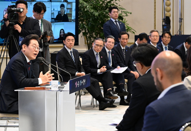 会見では記者を見下ろすような演壇を使わないといった工夫もあるようだ[青瓦台迎賓館で就任30日の記者会見を開いた李在明大統領=2025年7月3日、韓国・ソウル](C)EPA=時事