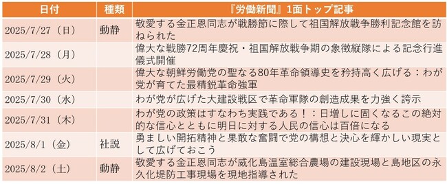 朝鮮戦争休戦から72年を迎え、関連記事が多く掲載された。7月27日付1面トップでは、金正恩(キム・ジョンウン)国務委員長が祖国解放戦争勝利記念館を訪問し、「神話的な戦争業績」こそが金日成(キム・イルソン)主席の中核的な業績であると述べたことなどが紹介された。「必ずや富国強兵の大業を成就し、反帝反米対決戦でも栄誉ある勝利者になる」といった言及も見られる。