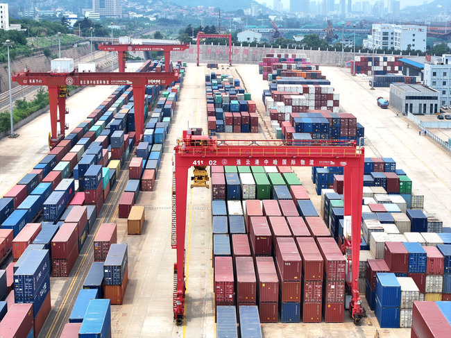 「中欧班列」によって、海に面していないため輸出に不利だった中国西部は、欧州に近い好立地へと転じた[中国江蘇省連雲港市の物流基地で「中欧班列」向けに積み込まれるコンテナ=2025年5月22日](C)CFOTO/Sipa USA via Reuters Connect