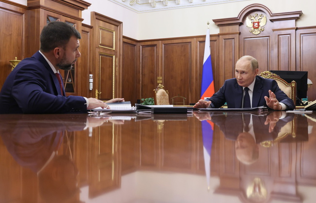 ロシア・ウクライナ戦争は国際的な「正義」の命運も握っている[ウクライナ東部の親ロシア派支配地域が自称する「ドネツク人民共和国」幹部のデニス・プシーリン氏と会談するプーチン大統領=2025年8月4日、ロシア・モスクワ](C)EPA=時事