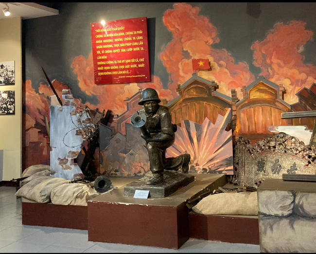 ハノイ・ベトナム軍事歴史博物館に展示されているベトミン軍兵士の「刺突爆雷」突撃像(筆者撮影)