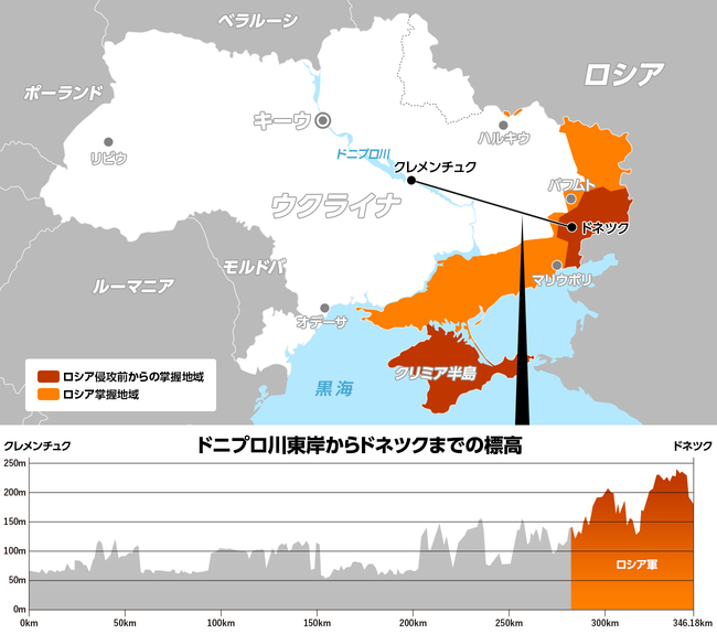 【図1】ドネツク州内の陣地を突破されると、ドニプロ川東岸まで防御に適した地形はほとんどない(筆者の分析をもとに編集部作成)