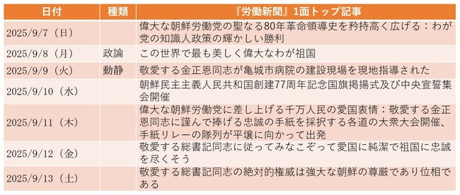 9日付第1面は、金正恩による亀城(クソン)市の病院建設現場への現地指導を上段で報じ、下段には炭素繊維固体発動機の地上噴出実験を参観したことについての記事と、建国77年に際して習近平国家主席が金正恩に宛てた祝電が掲載された。戦争特需を享受しているためか、最近は民生にかかわる経済建設も兵器開発も順調に進んでいるように見えるが、記事の大きさや掲載順からして経済建設における成果の誇示に重点が置かれていると言える。