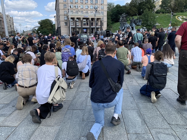 独立広場(マイダン)で開かれた追悼集会が終わり、膝をついてヴィクトリヤの柩を見送る人々[2025年8月8日、ウクライナ・キーウ](以下、特記のないものはすべて筆者撮影)