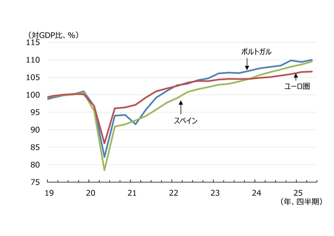 コロナショック前の2019年を基準(=100)とする指数で測ると、直近2025年4-6月期のポルトガルの実質GDP(国内総生産)は110まで水準を上げている(図表1)。一方、ユーロ圏全体では106.6にとどまっている。ドイツやフランス、イタリアの景気が低迷しているためだが、それを隣国スペインと一緒に打ち返しているのがポルトガルだ。