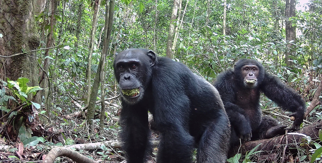 常緑樹パリナリ・エクセルサのスモモに似た果実を食べる2頭のオスのチンパンジー[コートジボワール・タイ国立公園](C)Aleksey Maro/UC Berkeley/Handout via REUTERS