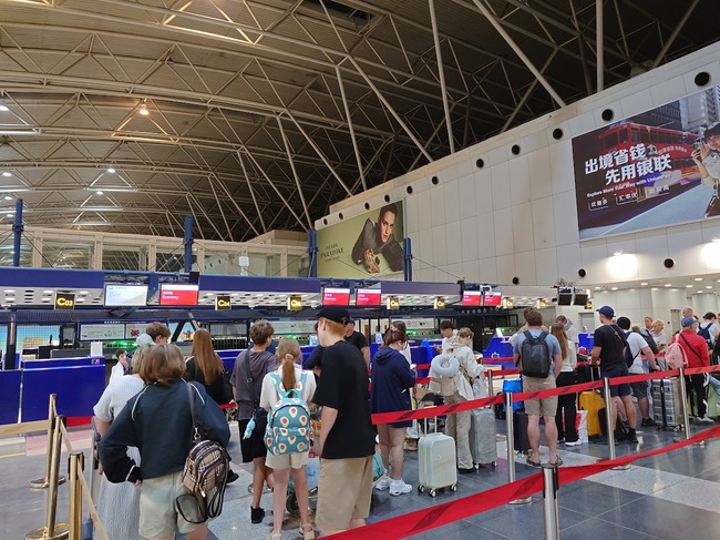 北京の空港でウラジオストク便の列に並ぶ乗客たち