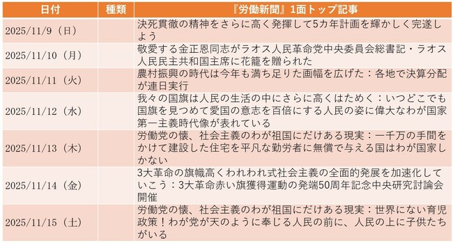 「労働党の懐、社会主義わが祖国にだけある現実」と題する第1面掲載の新連載が始まった。初回となる11月13日付は、「一千万の手間をかけて建設した住宅を平凡な勤労者に無償で与える国はわが国家しかない」とのサブタイトルで、金正恩(キム・ジョンウン)国務委員長が「国の根本である人民よりも貴重な存在はなく、人民の利益より神聖なものはありません」と述べたことを紹介し、「首領福」(注:首領に恵まれた福)、「党福」(注:党に恵まれた福)が誇示された。この手の記事は資本主義社会との対照で叙述されるのが常套で、「ある資本主義国でワンルームの住宅を持とうとすれば、一般労働者が受け取る賃金を100年あまり貯蓄しなければならない」ことも紹介された。