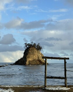 珠洲市の北側、日本海沿いを車で走ると、元の海岸線のはるか先まで広がる岩場に白い線が見える。数千年に一度とされる海岸の隆起で海底が露出した結果、海底にあった海藻などが乾燥して白い線のように見えている。この大規模な隆起によって石川県の面積は広がり、福井県と順位が逆転したほどの地殻変動だった。この広がった海岸線の上に仮設道路が敷設され、土砂崩れで塞がった道では今も補修工事が続く。