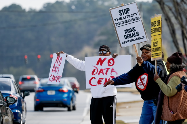 データ・センターの建設に伴う電力需給の逼迫は、電気料金の値上げの原因として米中間選挙の争点「アフォーダビリティ(家計負担の重さ)」に直結する[データ・センターの建設に抗議活動を行う人々=2025年12月13日、アメリカ・ジョージア州ディケーター](C)EPA=時事
