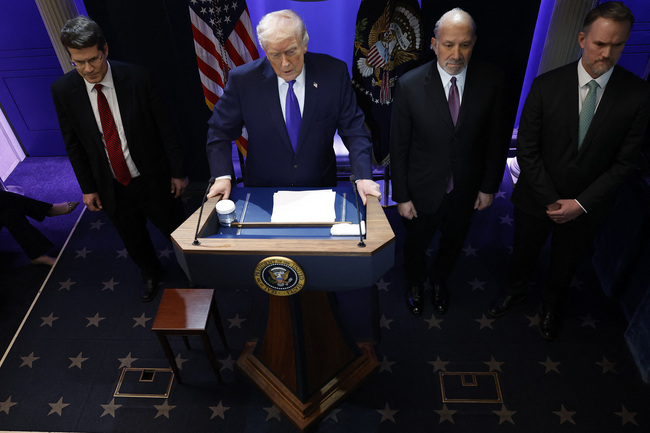 トランプ大統領(中央左)は会見で、関税収入の返金については法廷闘争になると発言した[(左から)ジョン・サウアー訟務長官、ラトニック商務長官、ジェミソン・グリア通商代表も同席=2026年2月20日、アメリカ・ワシントンDCのホワイトハウス](C)AFP=時事