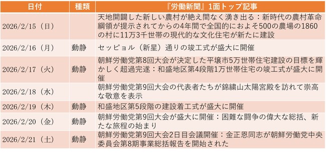 2月19日、朝鮮労働党第9回大会が開幕した。20日付が第1面から第3面にかけて報じた。党中央委員会政治局の委任によって趙甬元(チョ・ヨンウォン)党書記が司会を担い、大会執行部としては、金正恩(キム・ジョンウン)総書記のほか、朴泰成(パク・テソン)内閣総理、崔龍海(チェ・リョンヘ)最高人民会議常任委員長、趙甬元、李日煥(リ・イルファン)党書記、朴正天(パク・ジョンチョン)党中央軍事委員会副委員長、李煕用(リ・ヒヨン)党書記、趙春龍(チョ・チュンニョン)党書記、金徳訓(キム・ドックン)党書記、崔東明(チェ・ドンミョン)党書記、崔善姫(チェ・ソニ)外相、努光鉄(ノ・グヮンチョル)国防相、李炳哲(リ・ビョンチョル)党軍需政策担当総顧問ら計39人が選任された。金与正(キム・ヨジョン)党副部長は36番目に紹介された。