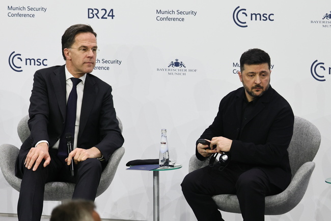 ウクライナのNATO加盟問題は、NATO自身の本質を問うことにもつながる[ミュンヘン安全保障会議の公開討論に臨むNATOのマーク・ルッテ事務総長(左)とウクライナのゼレンスキー大統領(右)=2026年2月14日](C)EPA=時事