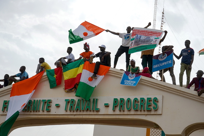 西アフリカのクーデター首謀者たちは政権転覆にあたって、既存のエリート層が旧宗主国フランスと結託して権力と利潤を貪っていると主張した[西アフリカ諸国経済共同体(ECOWAS)の軍事介入に反対するニジェールのクーデター支持派=2023年8月20日、ニジェール・ニアメー](C)EPA=時事