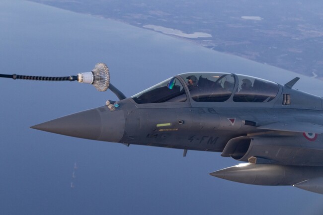 2025年12月には英国高官によるフランスの定例核演習「POKER」の視察も実現した[核攻撃を想定した模擬任務で空中給油を受けるフランス空軍のラファール戦闘機=2026年3月17日](C)AFP=時事